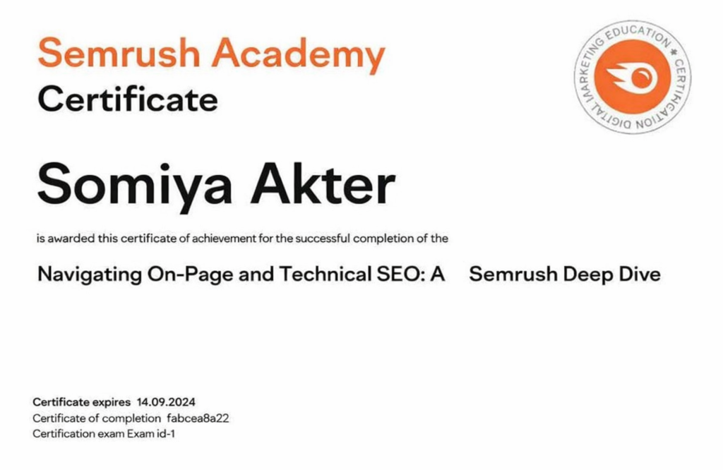 Somiya Akter’s commitment to professional development and staying ahead in the ever-evolving SEO field is exemplified by his SEMrush Certification. SEMrush is one of the most respected tools in the SEO industry, and Somiya’s certification reflects her deep expertise in using it to enhance her SEO strategies. With SEMrush, Somiya is able to perform detailed keyword research, competitor analysis, backlink audits, and track search engine rankings, all of which are crucial for a successful SEO campaign. This certification demonstrates Kamrul’s proficiency in the tools and techniques that industry leaders use to drive results. Kamrul’s expertise in SEMrush, combined with her other skills in Local SEO and Google Business Profile optimization, makes him a top-tier SEO expert. By continually investing in her education and skill set, Somiya ensures that she provides the highest level of service to her clients, helping them achieve lasting success online.